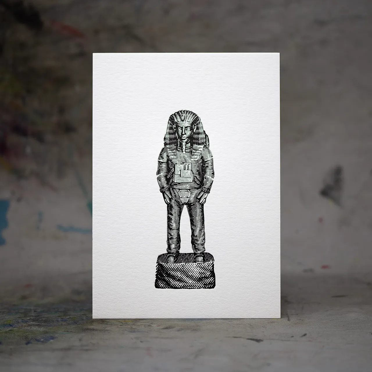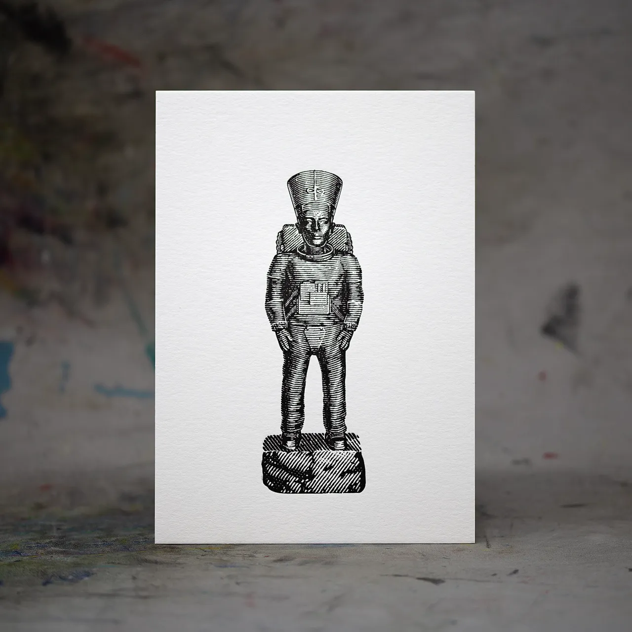 ‘Ancient Astronauts’ letterpress prints for Imbue in black ink on textured card stock