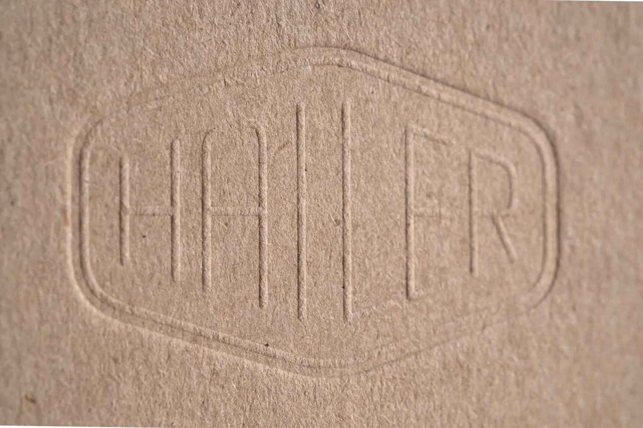 Letterpress printed in one colour & blind debossed on heavyweight 1,500 micron 100% post-consumer recycled greyboard.