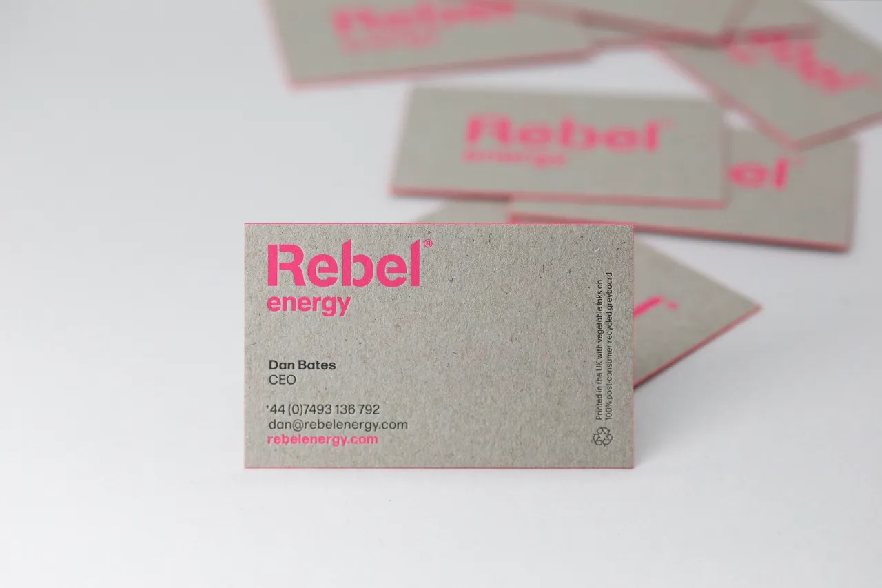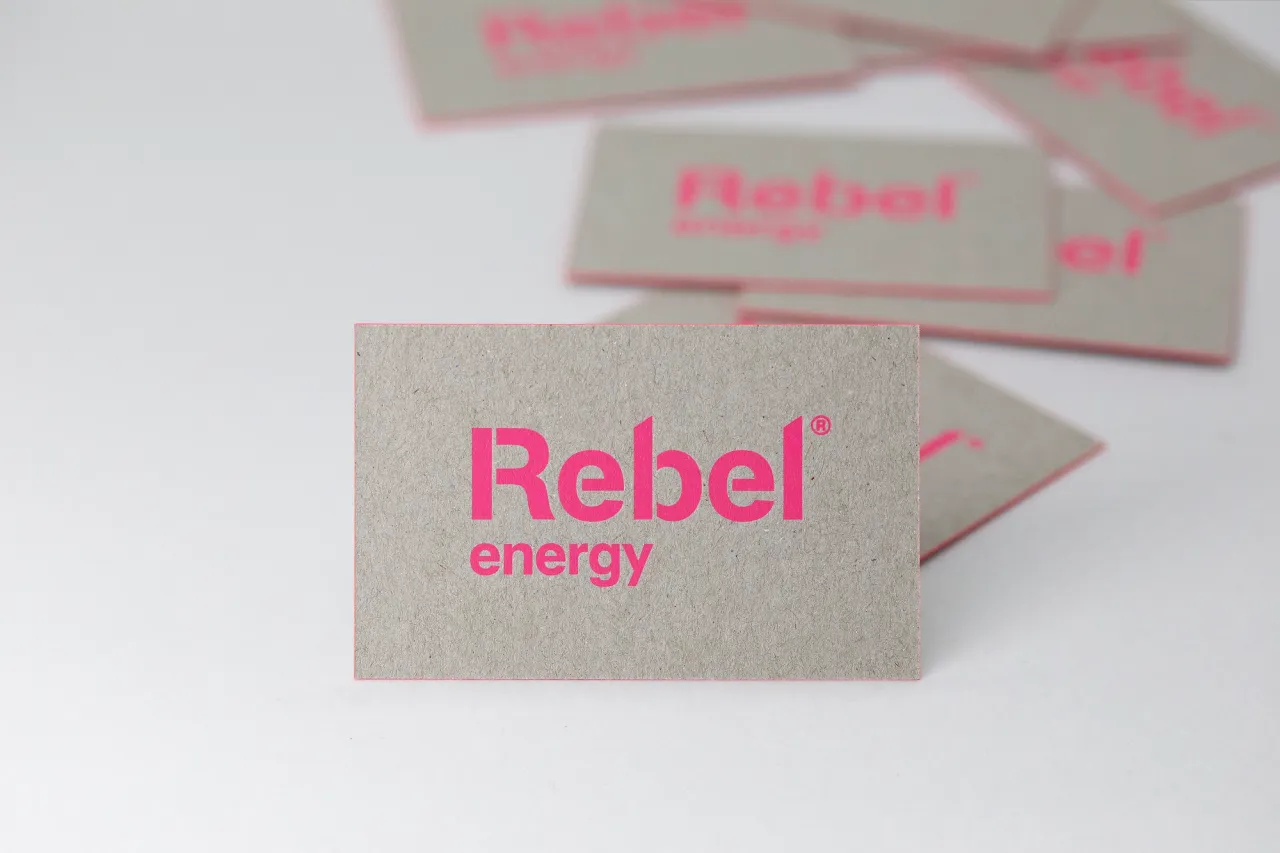 Edge painted letterpress business cards for Rebel Energy on recycled greyboard