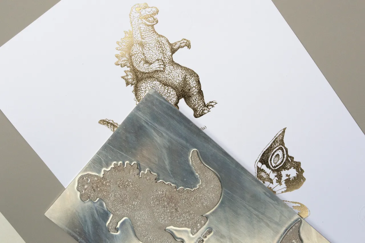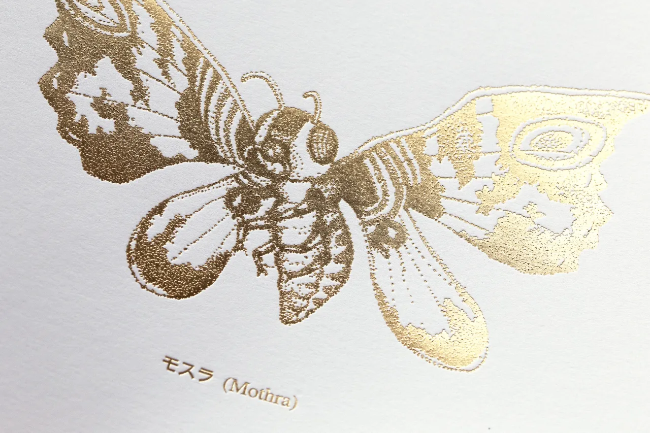 Gold foil stamped & blind debossed Godzilla vs Mothra prints for Kwoky