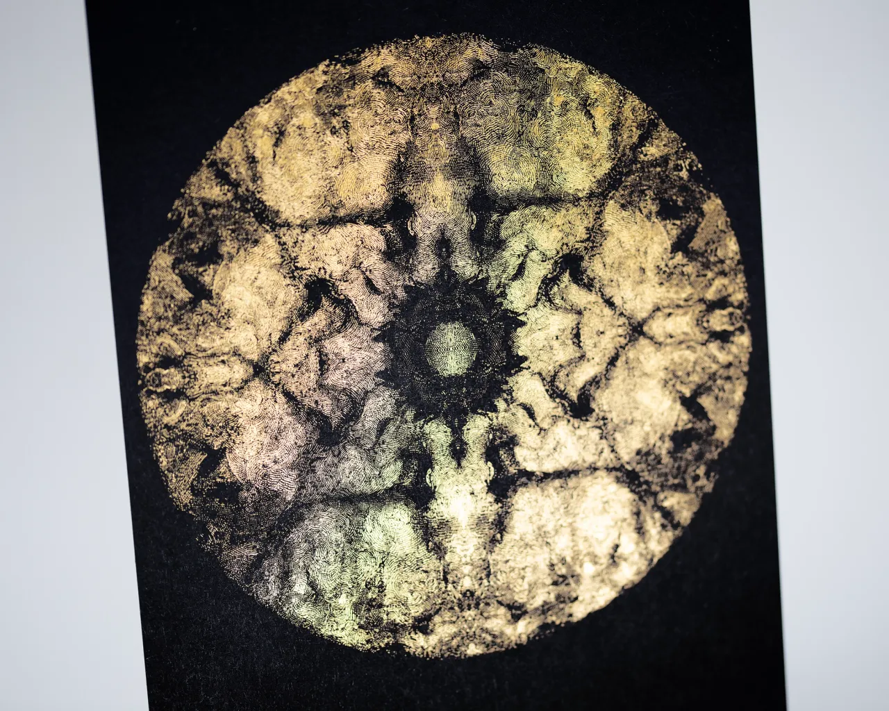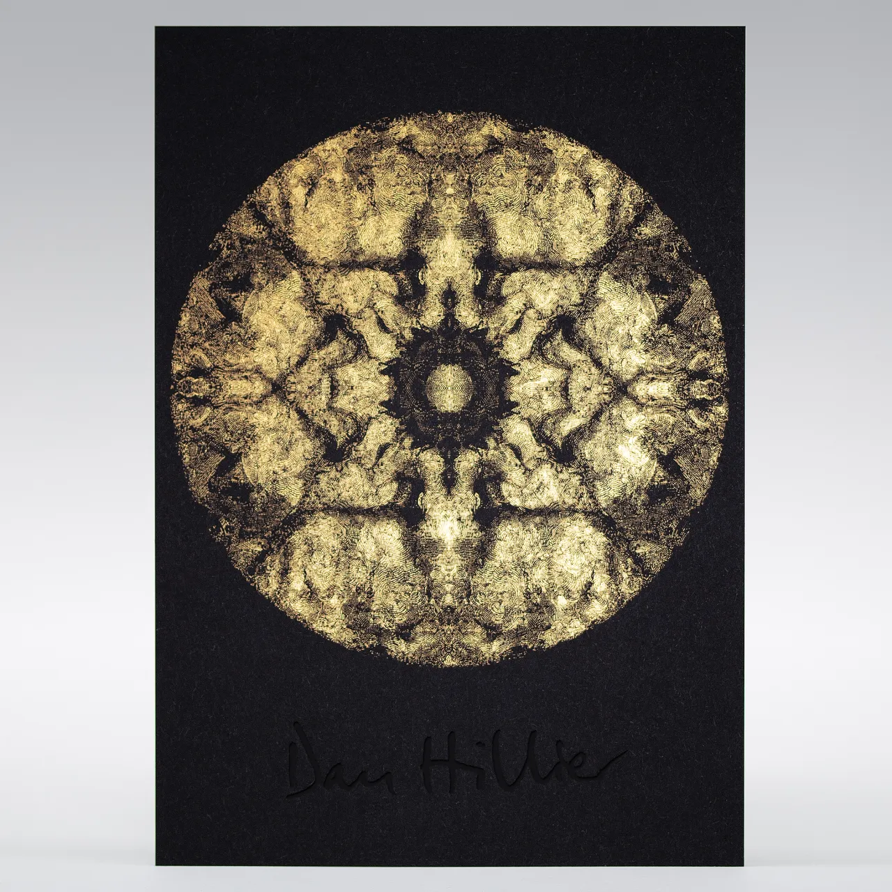 Gold hot foil stamped & blind debossed ‘Transmission’ prints on deep black card stock for Dan Hillier