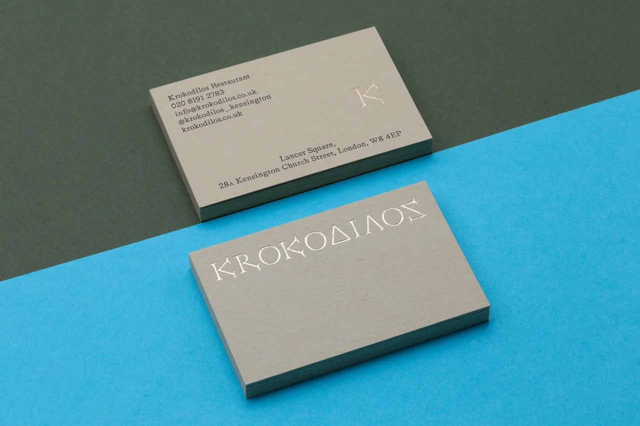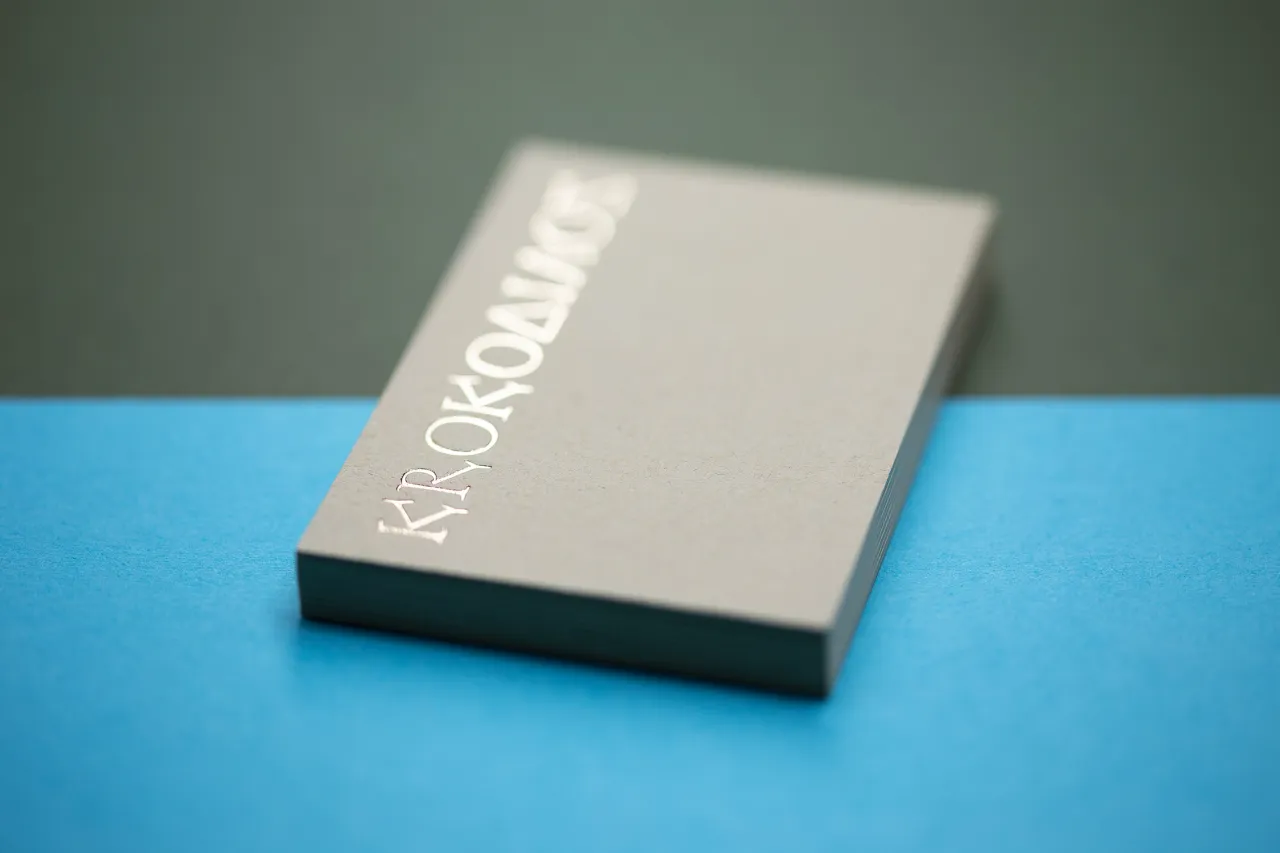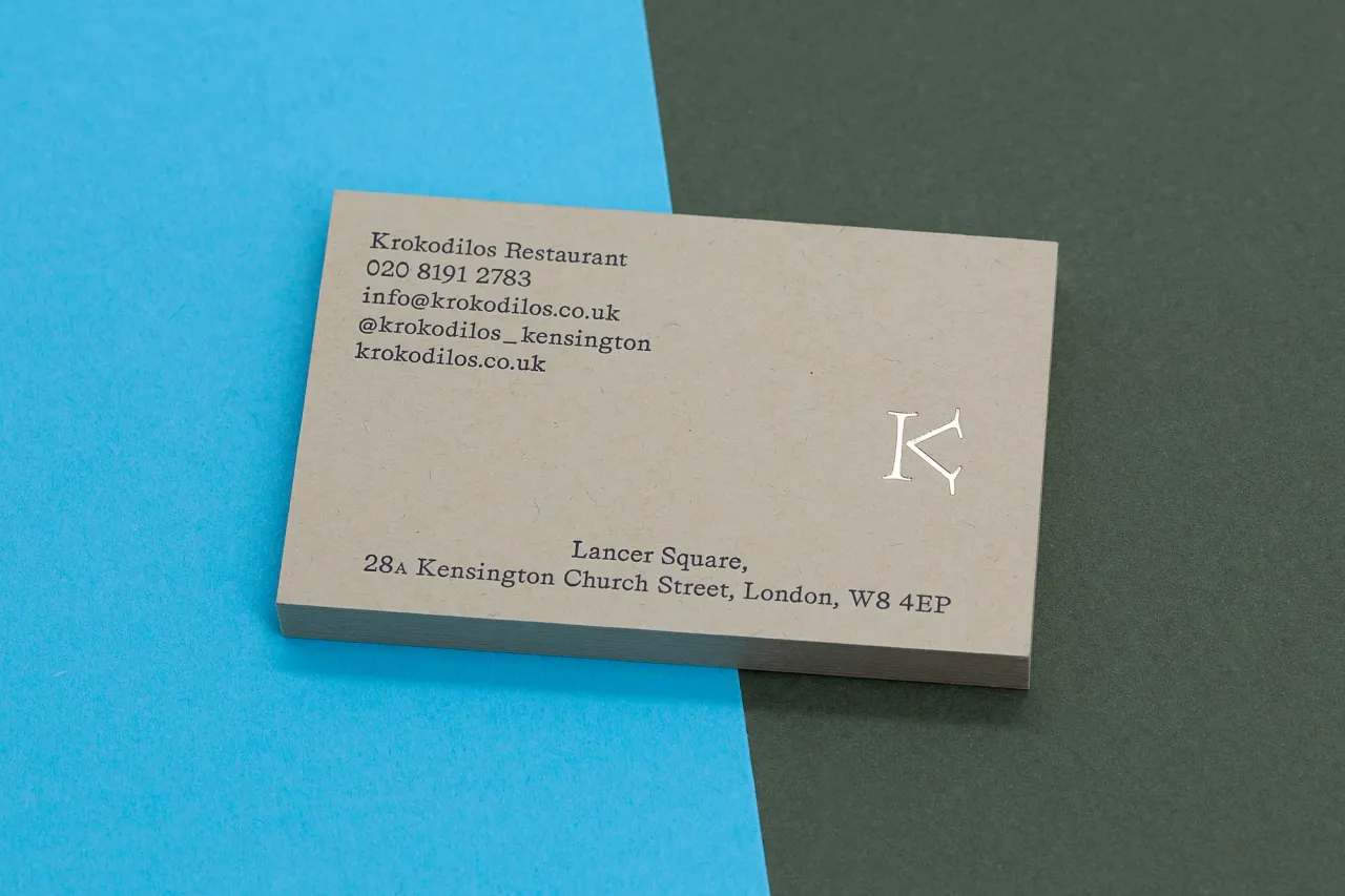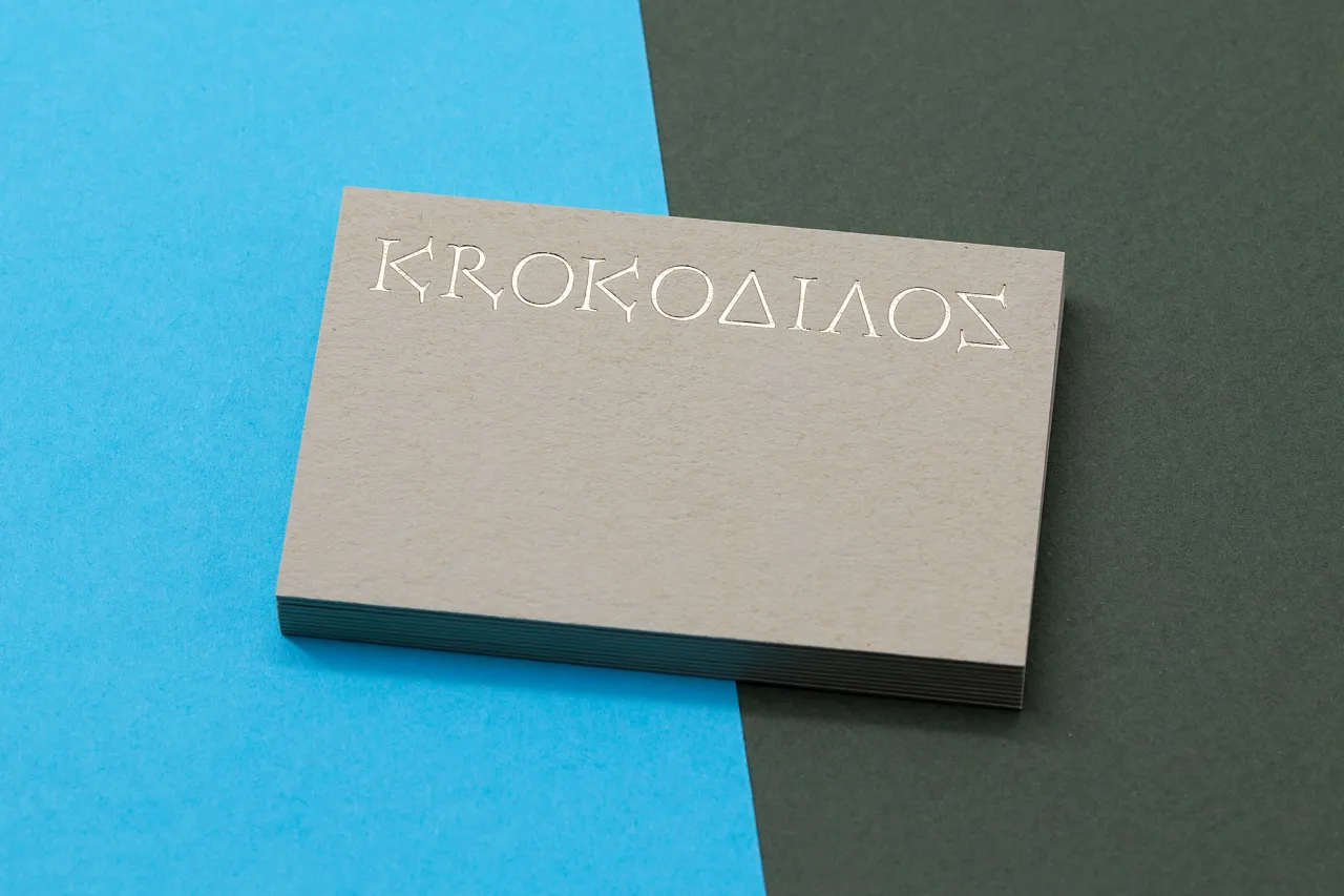 Gold hot foil stamped & letterpress printed business cards on kraft card for Krokodilos
