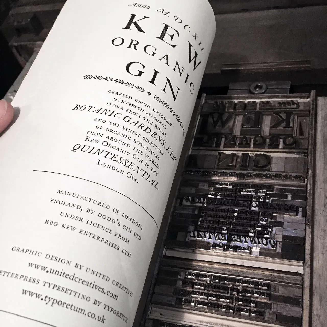 Hand-typesetting & metal type proofing for Kew Organic Gin packaging and bottle labels