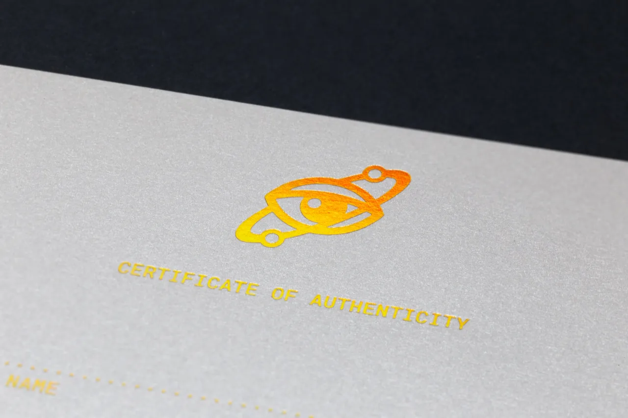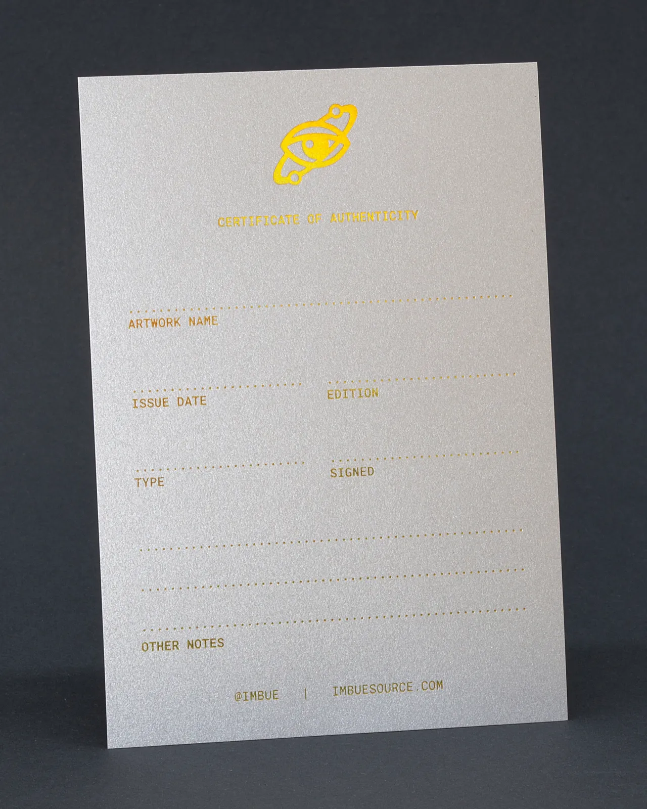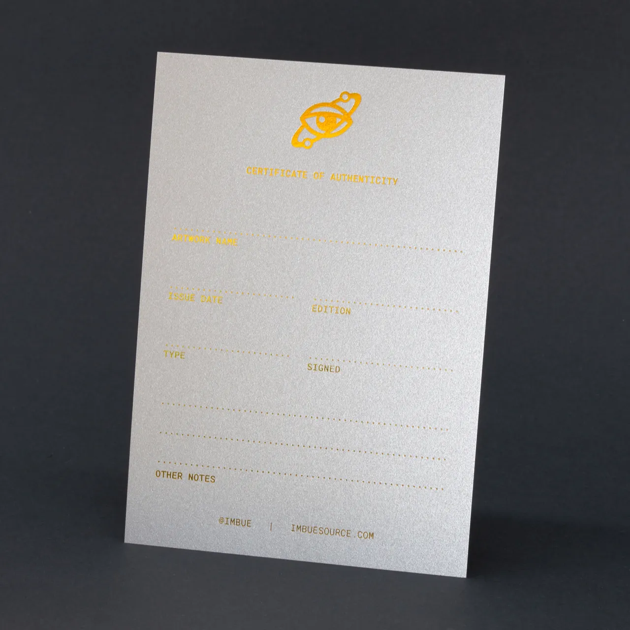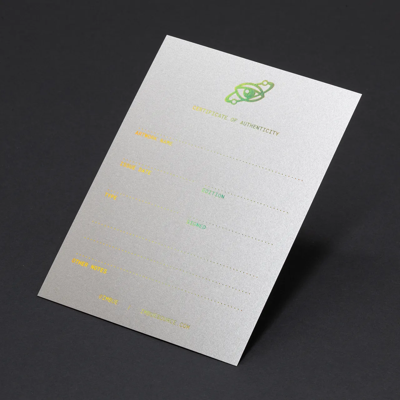 Holographic gold hot foil stamped certificates of authenticity on silver card stock for Imbue