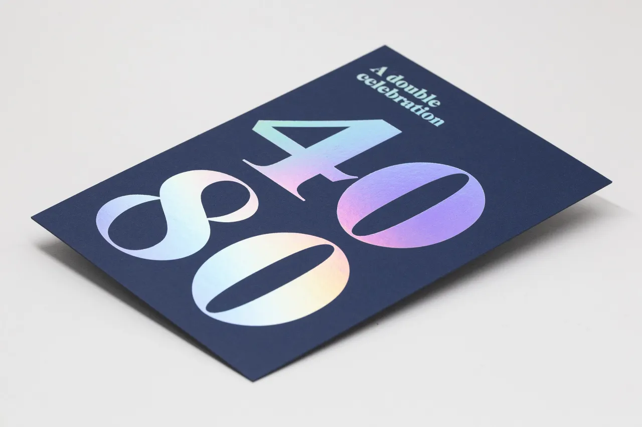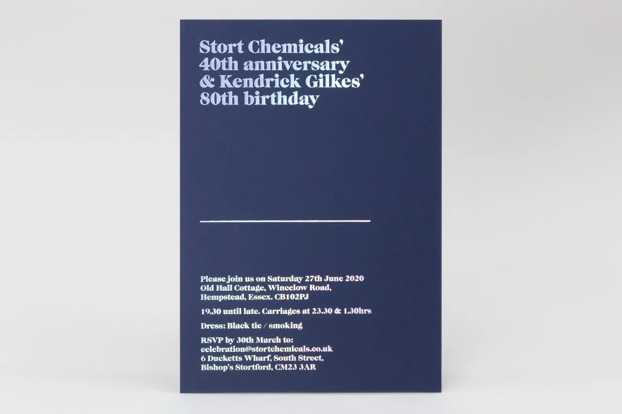 Hot foil stamped in silver holographic foil on 700gsm Colorplan Loch Blue card stock.