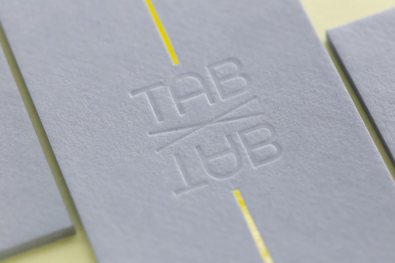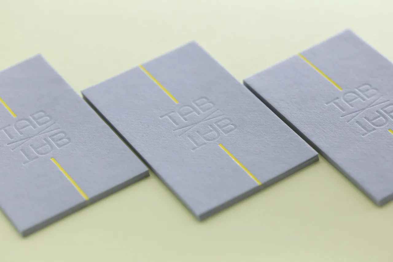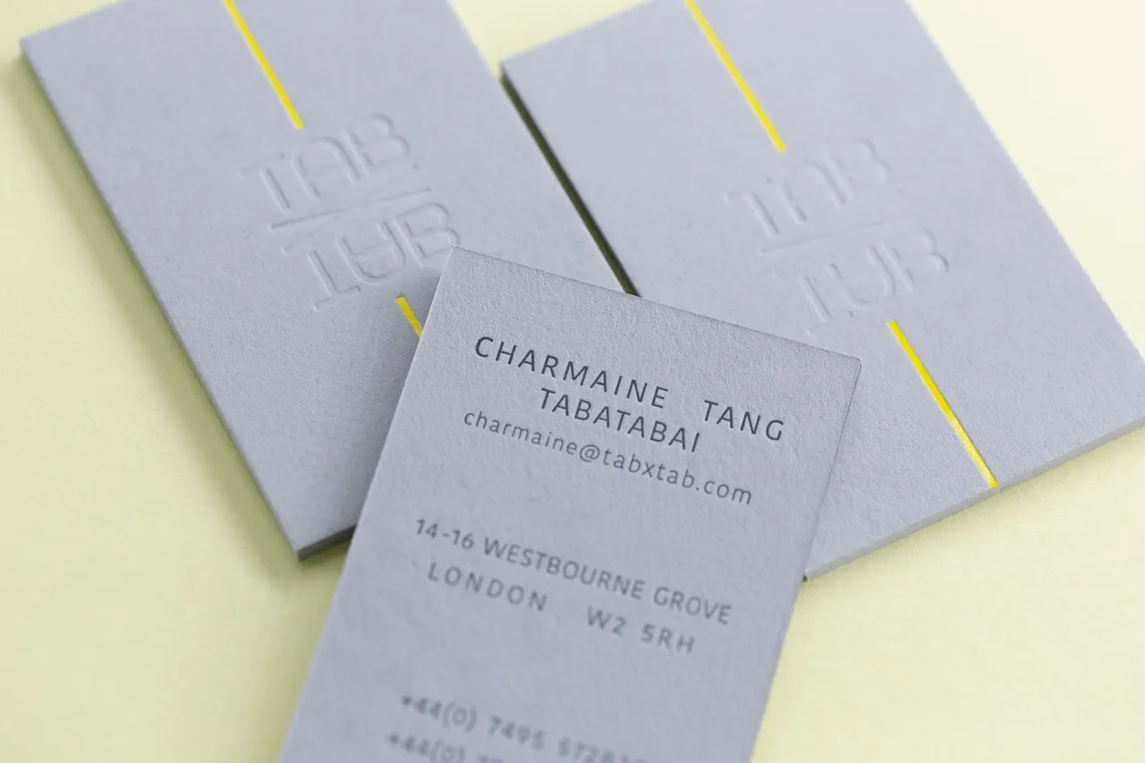 Hot foil stamped in Kurz matt yellow pigment foil, blind debossed and letterpress printed in black ink on 530gsm Gmund Heidi 100% recycled Faded Grey card stock.