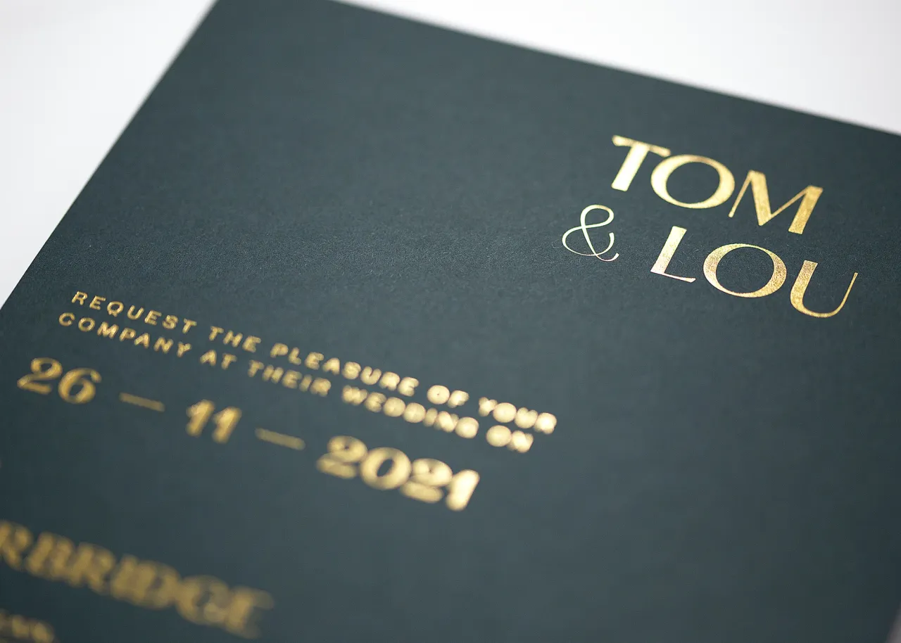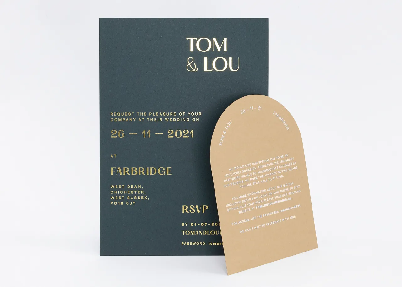 The wedding invitation was hot foil stamped in Foilco Conquest Gold onto 540gsm GF Smith Colorplan Racing Green card stock. The details card was hot foil stamped in white pigment foil onto 350gsm Colorplan Stone card stock and custom die-cut to shape.