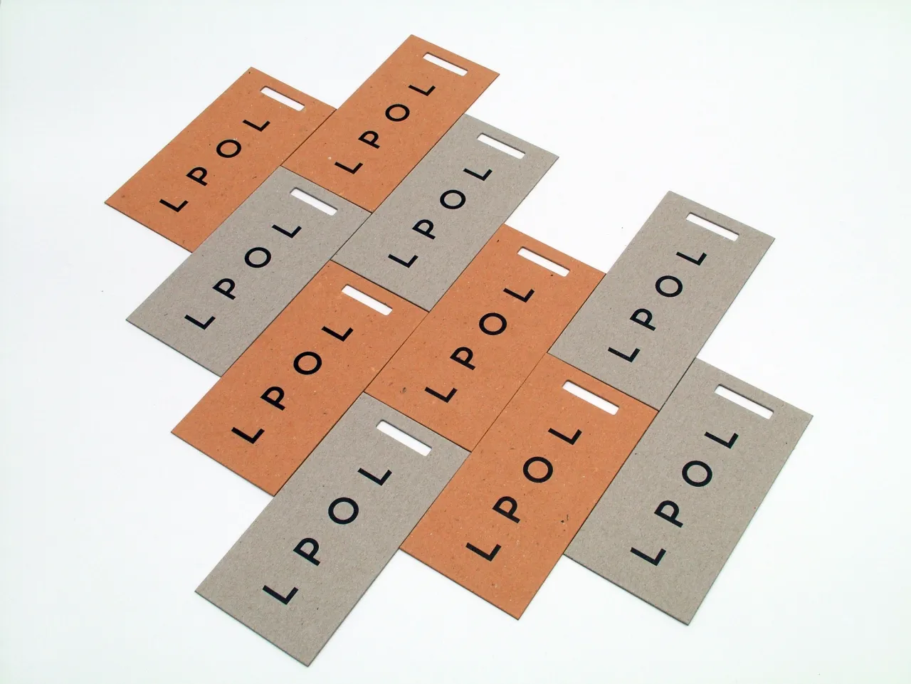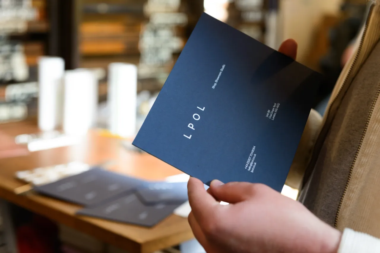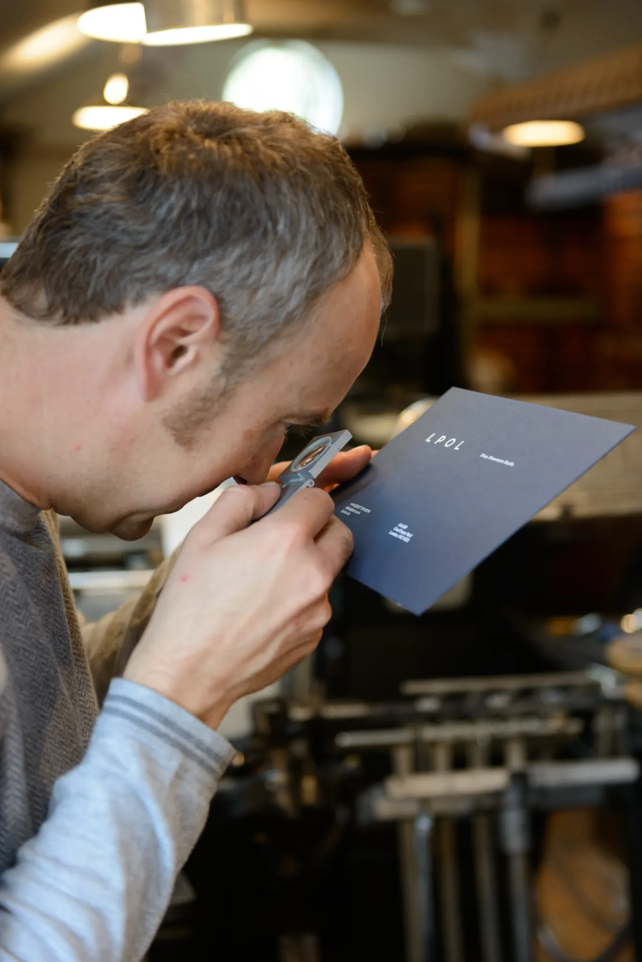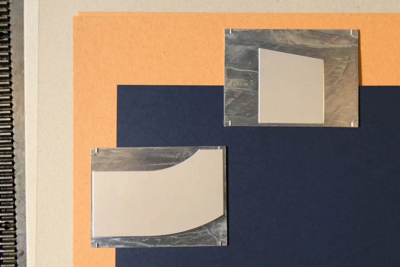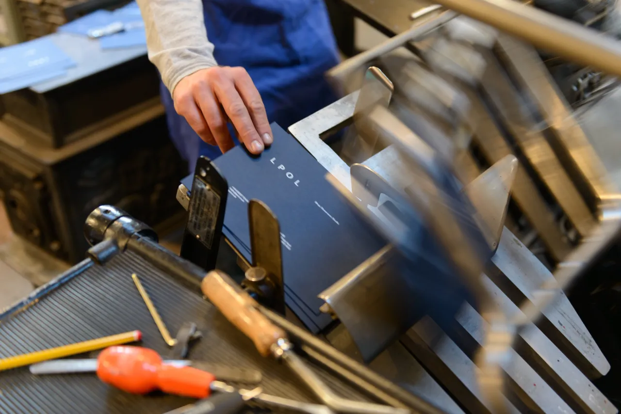 Letterpress printed in black ink onto two shades of 100% post-consumer recycled Nomad card stock and white foil stamped onto Colorplan Lock Blue heavyweight card stock.
