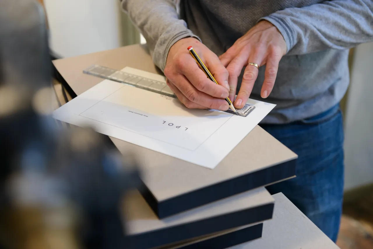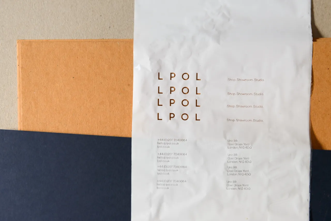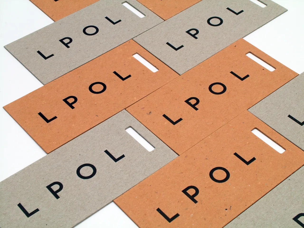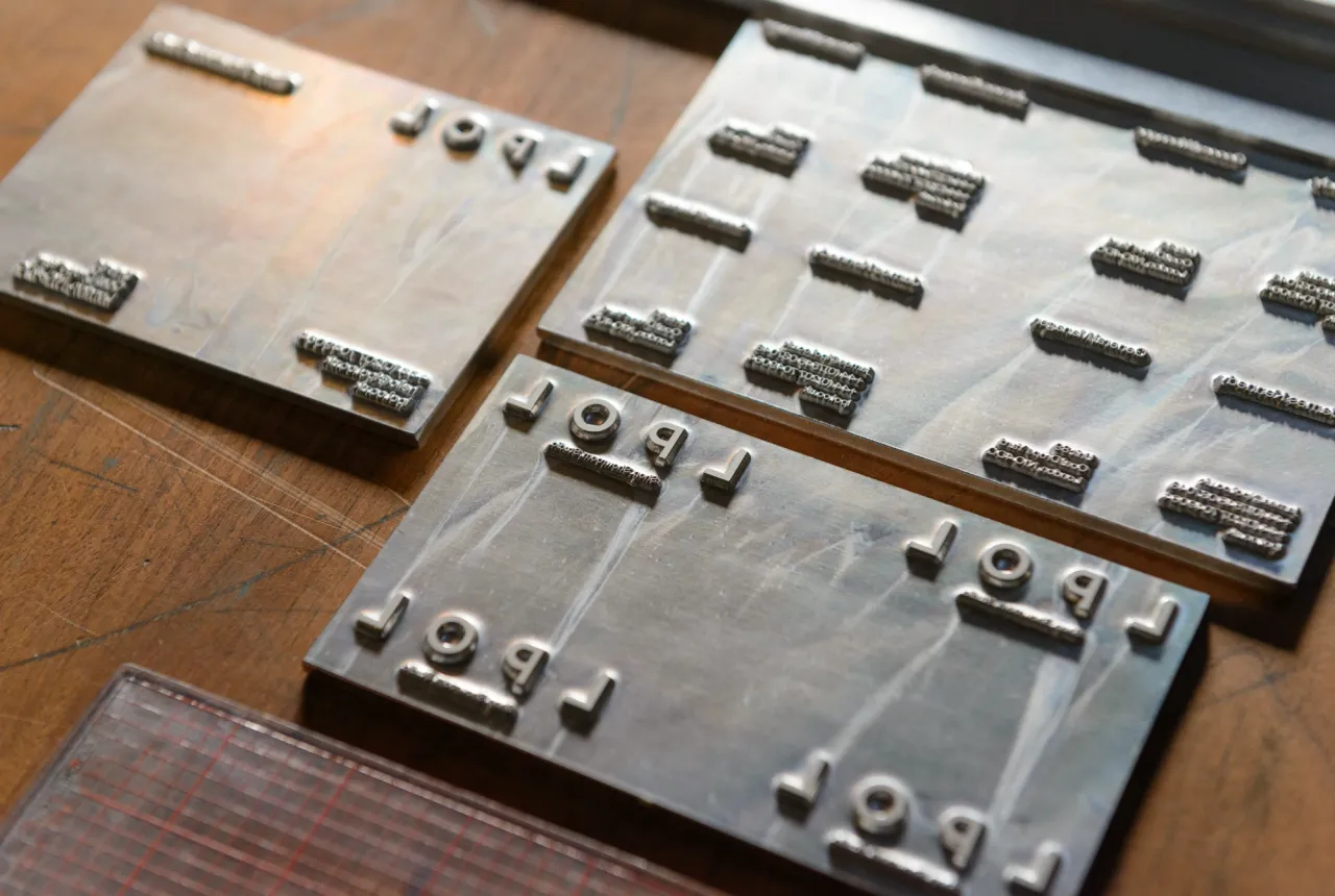 Letterpress printed in black ink onto two shades of 100% post-consumer recycled Nomad card stock and white foil stamped onto Colorplan Lock Blue heavyweight card stock.