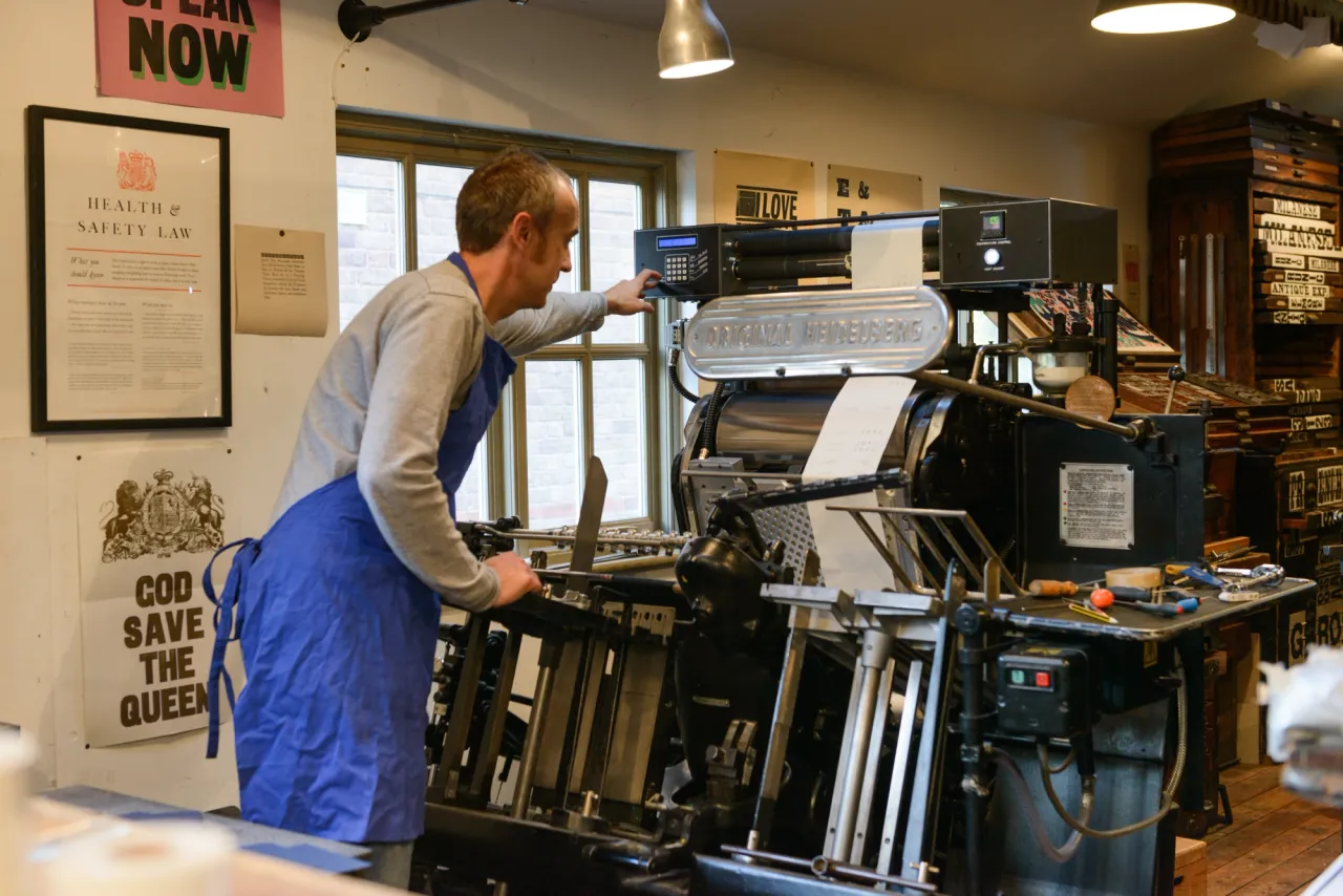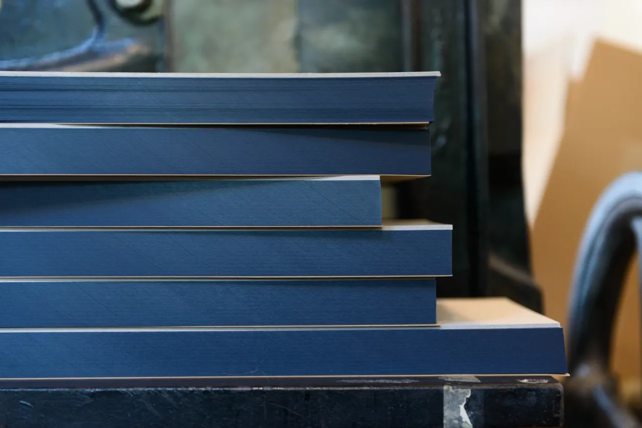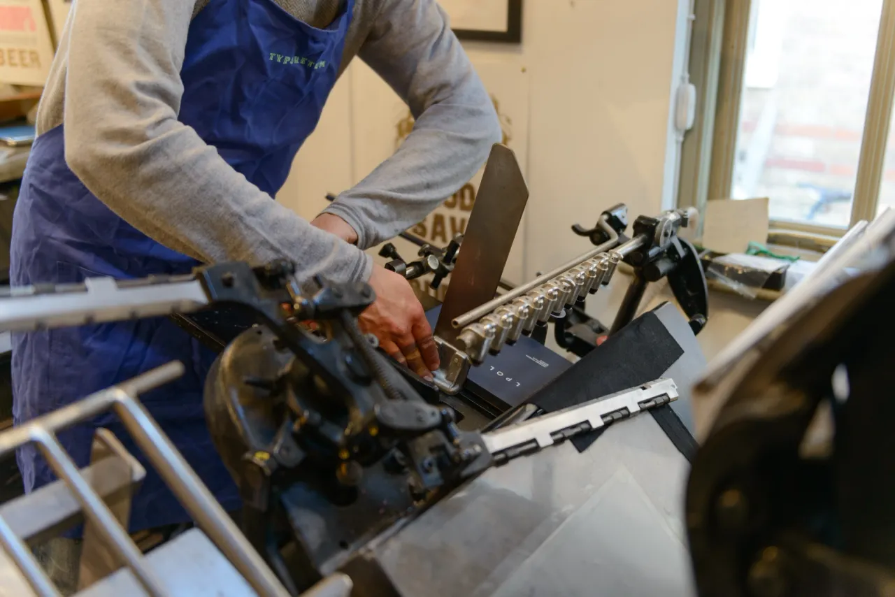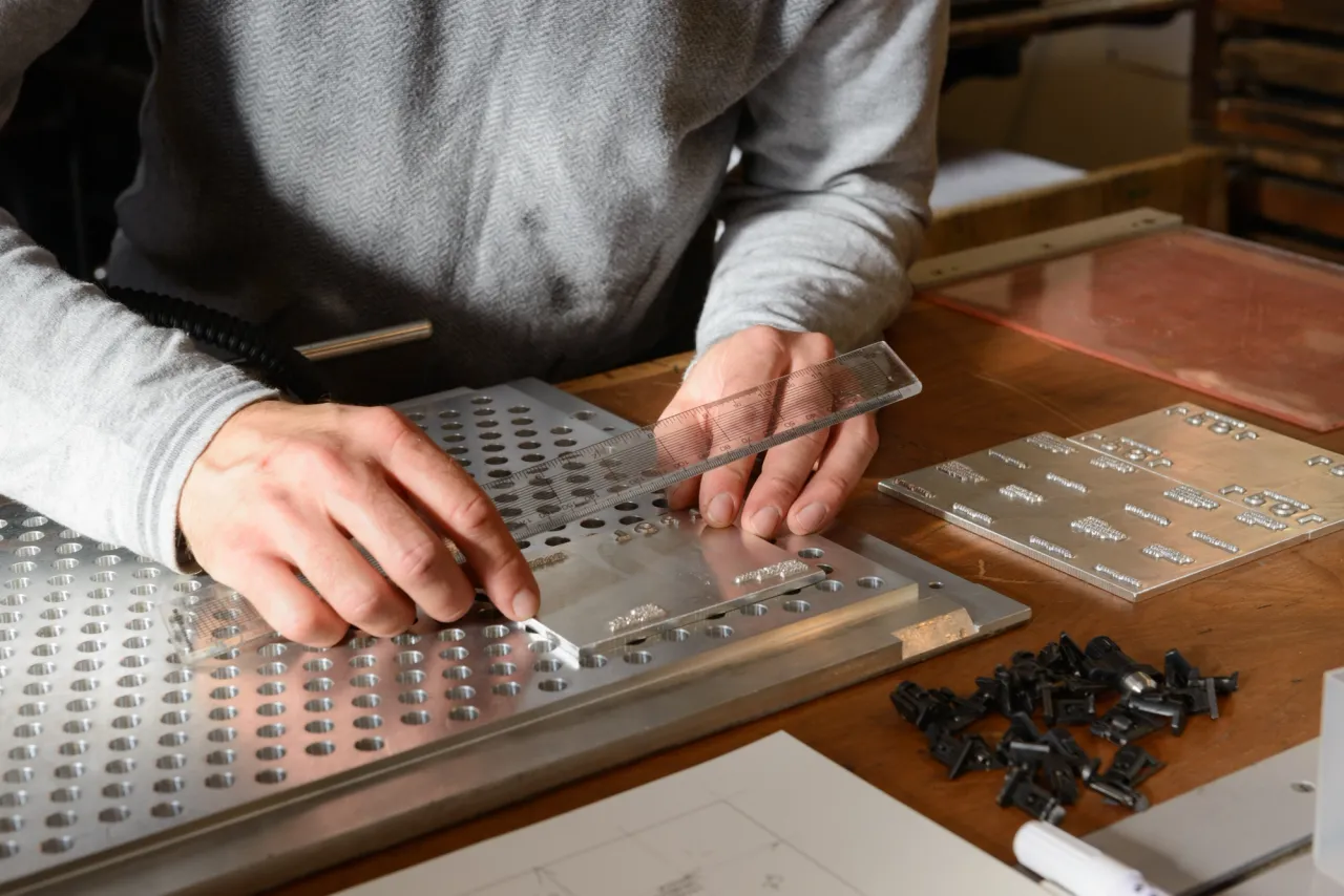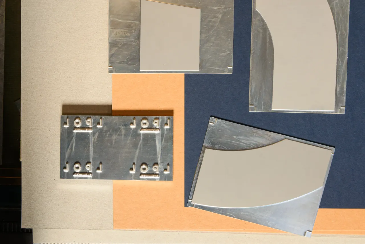Letterpress printed in black ink onto two shades of 100% post-consumer recycled Nomad card stock and white foil stamped onto Colorplan Lock Blue heavyweight card stock.