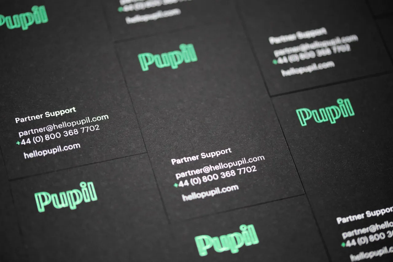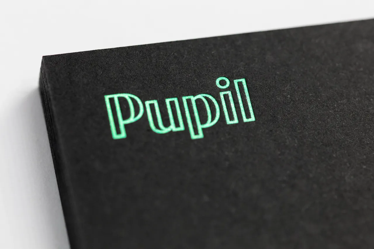 Hot foiled in Foilco Shimmer Green & Kurz matt white pigment foils onto 540gsm Colorplan Ebony card stock.