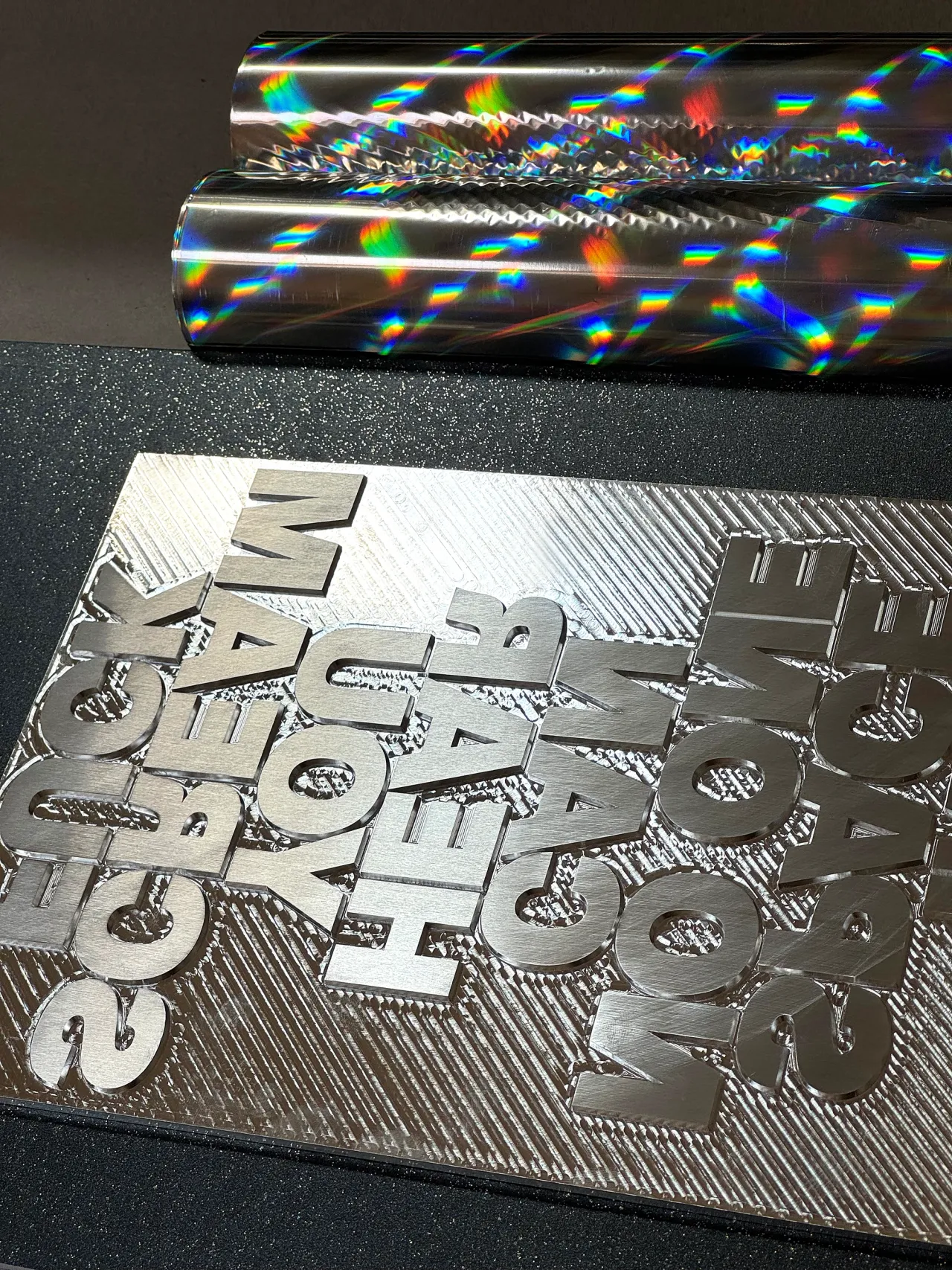 Limited edition of hot foil stamped A3 prints in silver holographic foil on 270gsm holographic rainbow Mirri card stock.