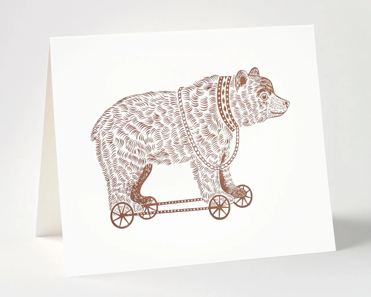 Letterpress printed ‘Bear on Wheels’ greeting cards for St Jude’s, featuring illustration by Emily Sutton