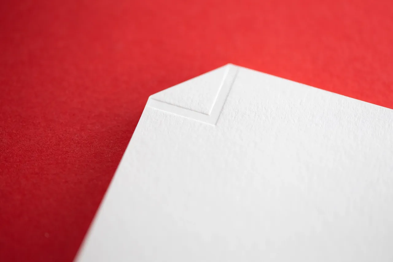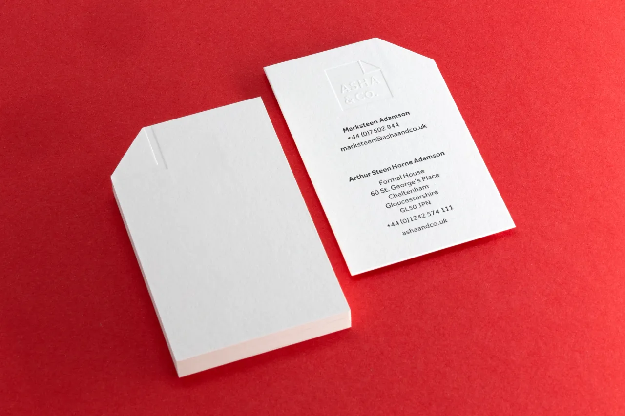 Letterpress printed in black to one side on 540gsm Colorplan Bright White card stock, with a heavy blind debossed logo & custom die-cutting to shape.