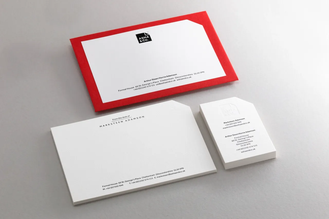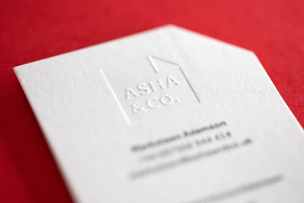 Letterpress printed, blind debossed & die-cut business cards, desk cards and mailing labels for ASHA
