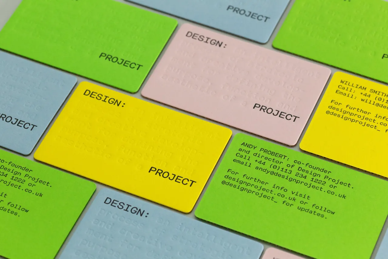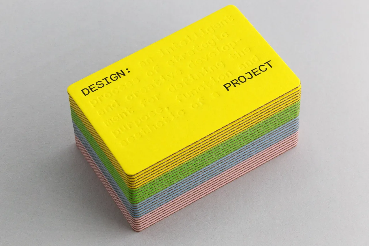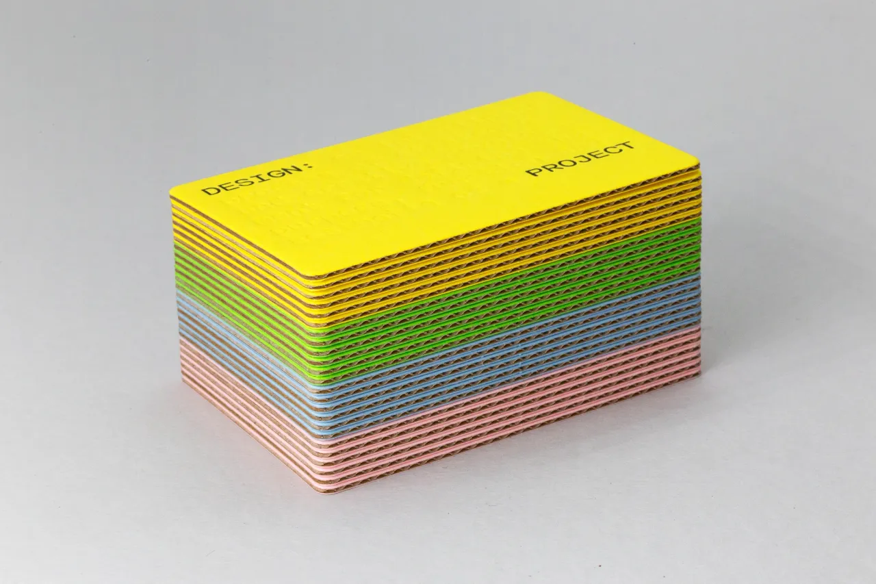 Letterpress printed, blind debossed and die-cut business cards on heavyweight micro-corrugated card