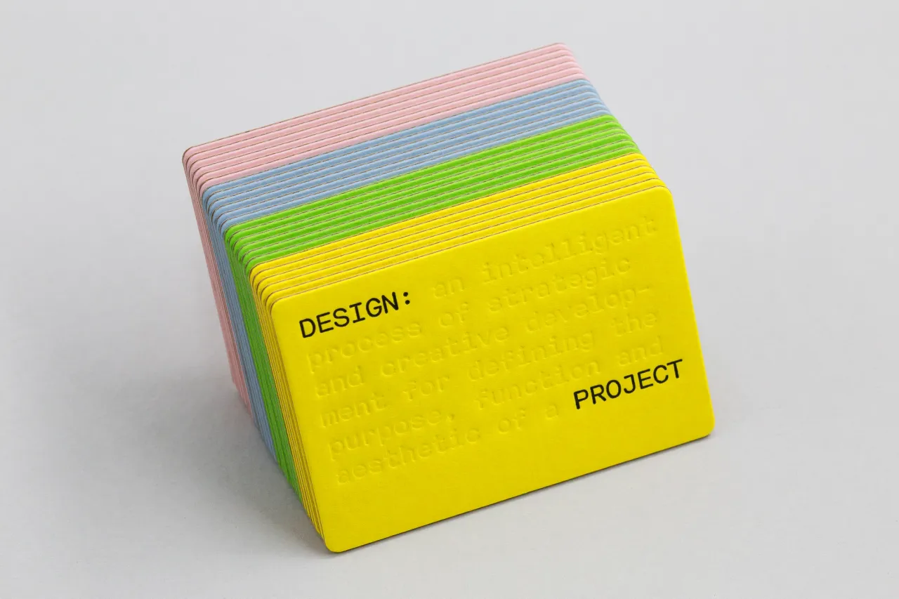 Letterpress printed in one colour & blind debossed onto 670gsm Gmund Colors Volume 01, 11, 31 & 32 card, with corrugated cardboard core, and die-cut to shape.