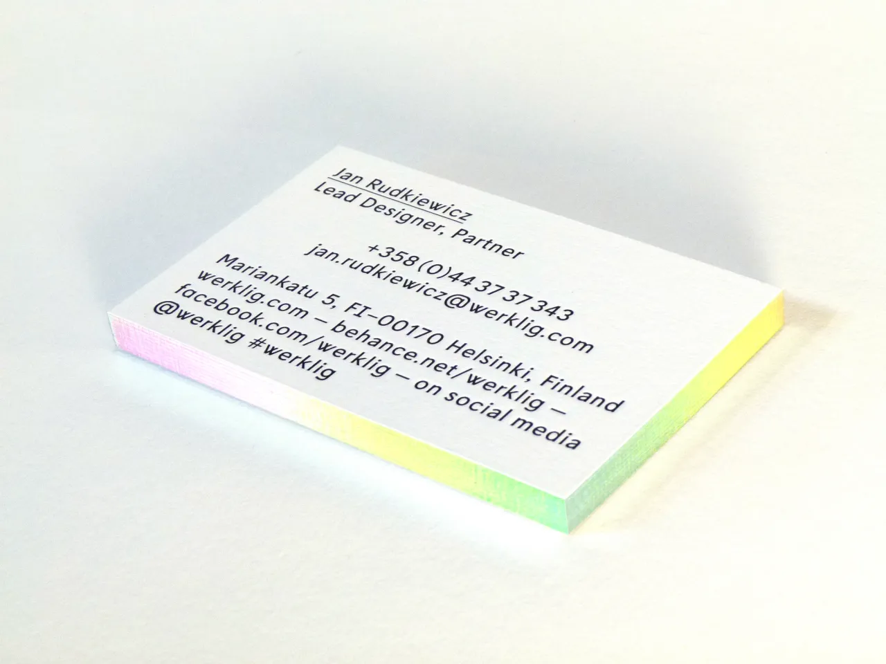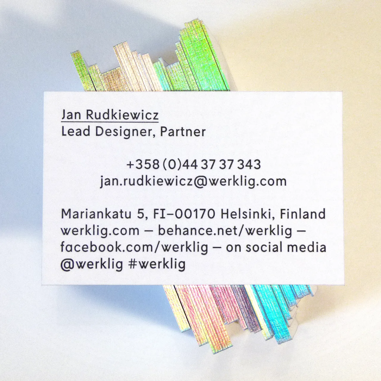 Letterpress printed business cards with silver holographic gilt edging for Werklig