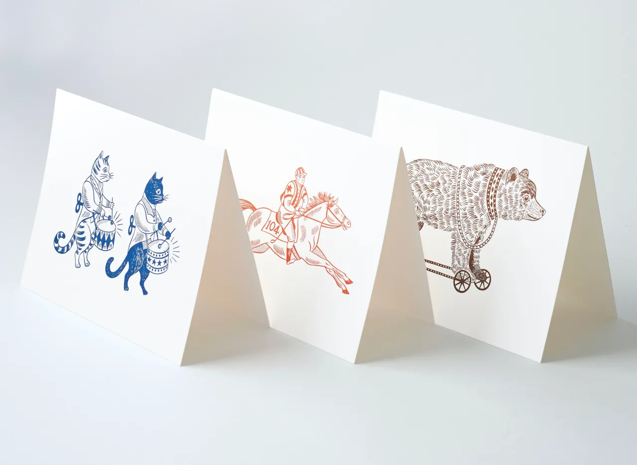 Letterpress printed ‘Clockwork Cats’ greeting cards for St Jude’s, featuring illustration by Emily Sutton
