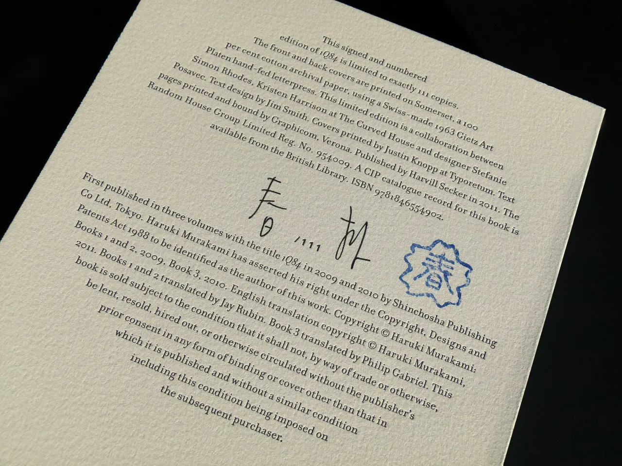 Letterpress printed covers and book edge printing for signed & numbered Murakami 1Q84 limited edition