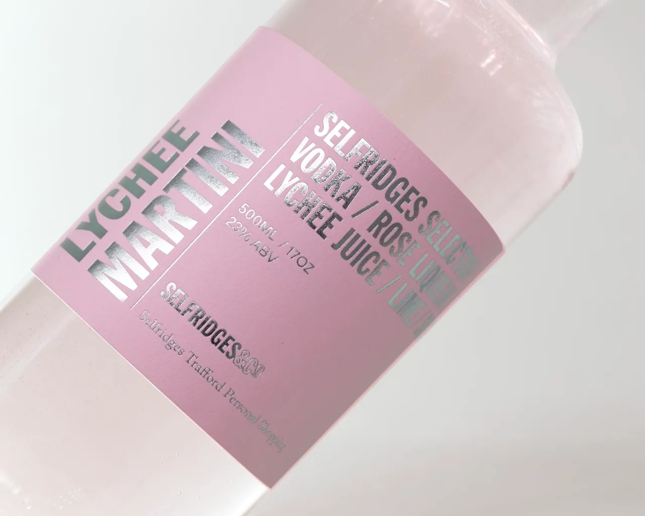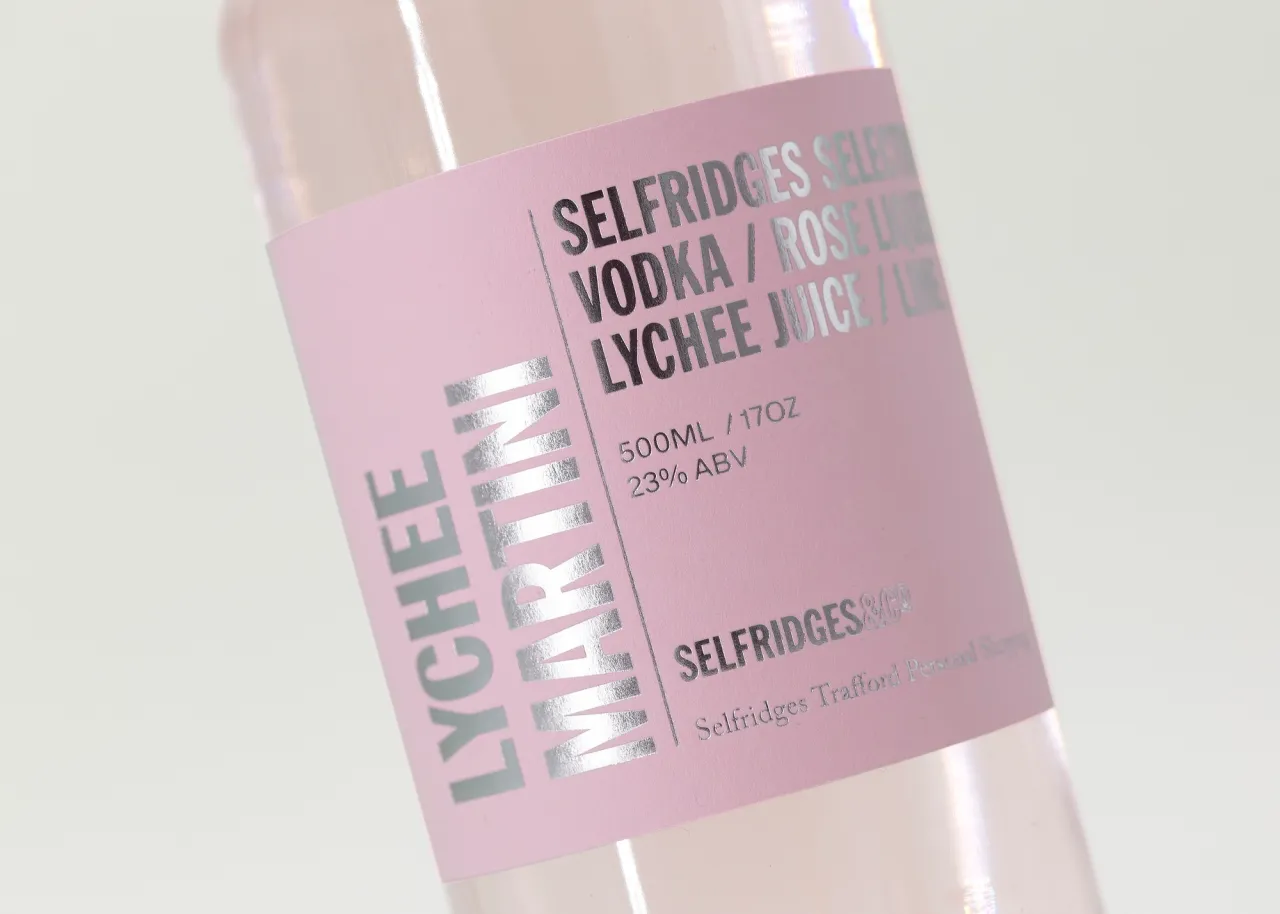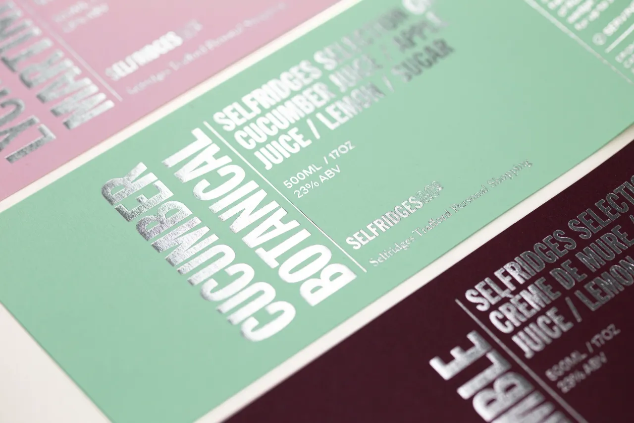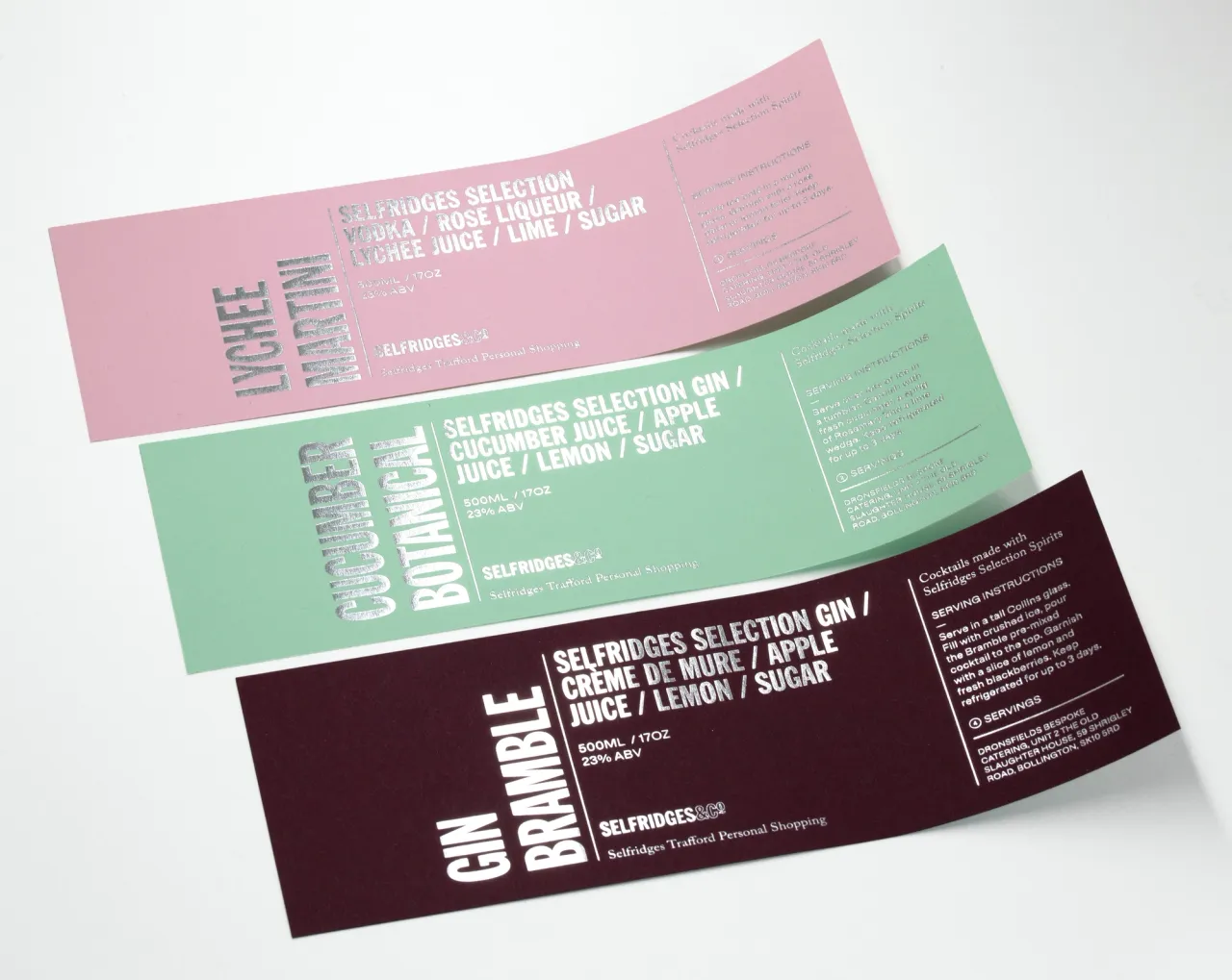 Limited edition cocktail and spirit labels, hot foil stamped in silver on a range of Colorplan label paper colours