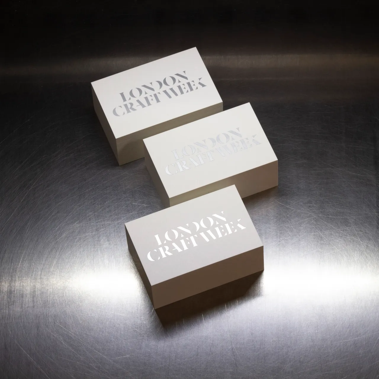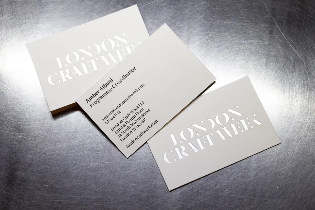 Satin silver hot foil stamped & letterpress printed business cards for London Craft Week