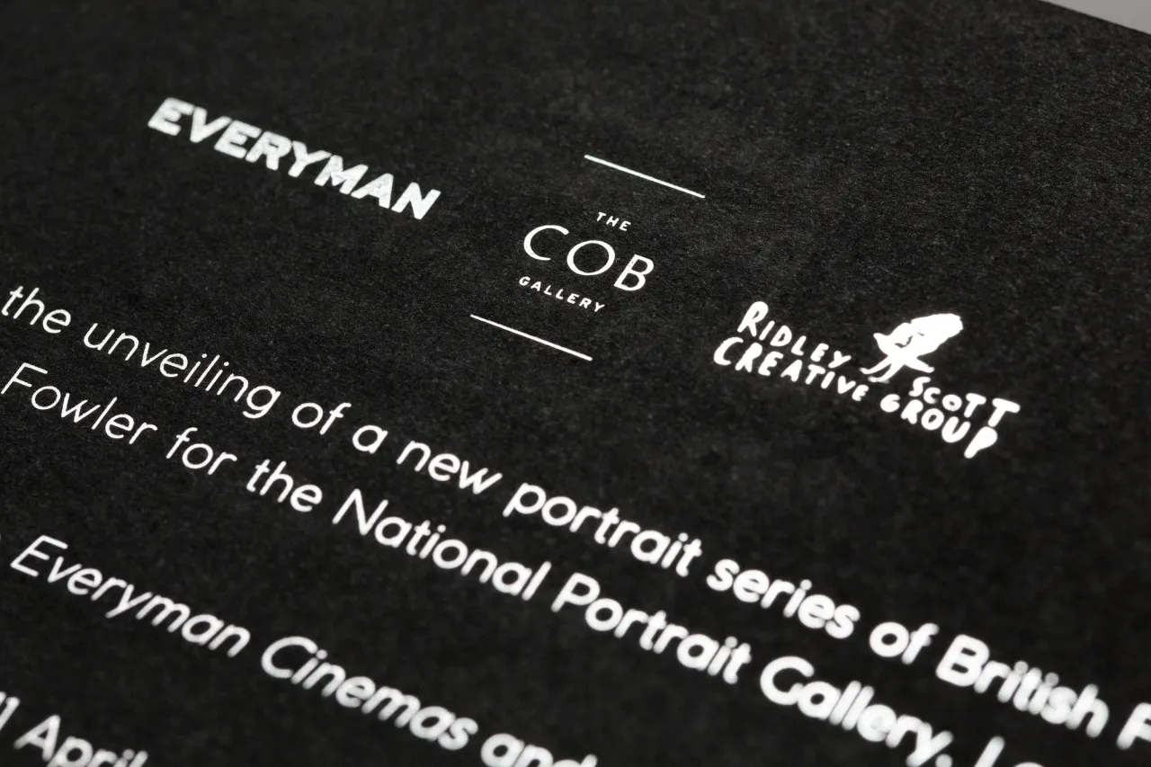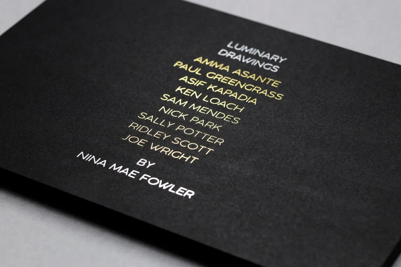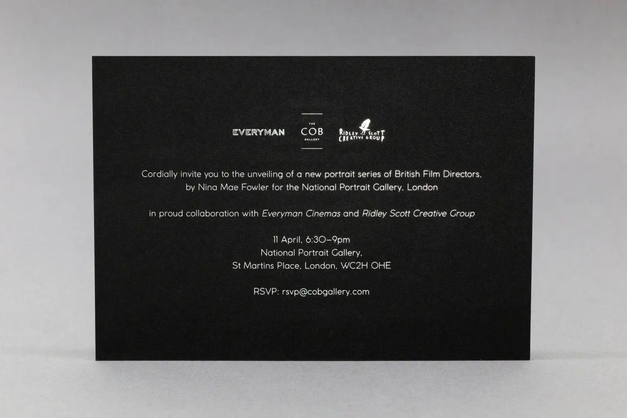 Silver & gold hot foil stamped Private View invitations on heavyweight black card stock