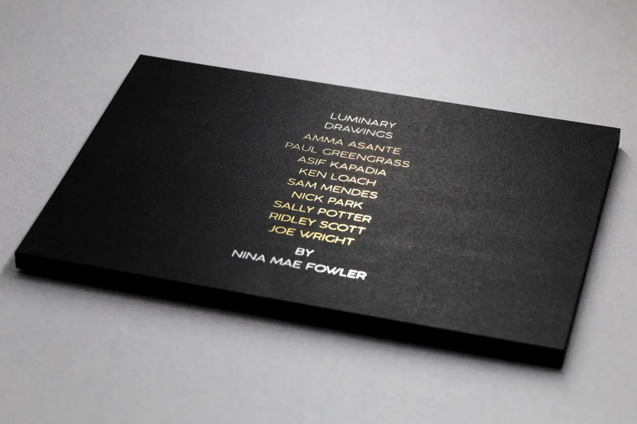 Hot foil stamped in Foilco Sterling Silver & Opulent Gold foils on heavyweight 740gsm Sirio Ultra Black card stock.