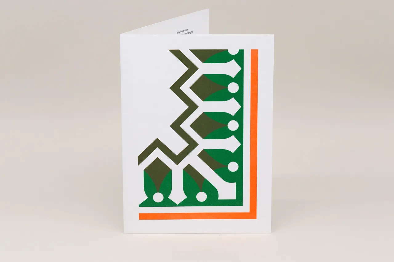 Three colour letterpress Christmas cards on GFSmith Wild White card stock