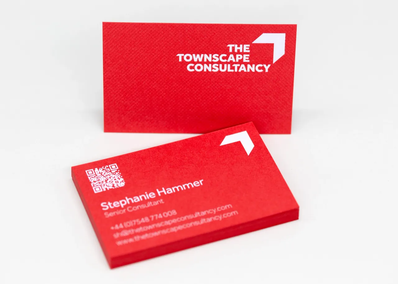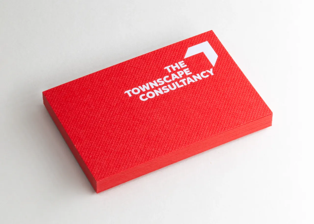 Hot foil stamped in white pigment foil on 350gsm Colorplan Bright Red with a Gravure surface texture embossing.