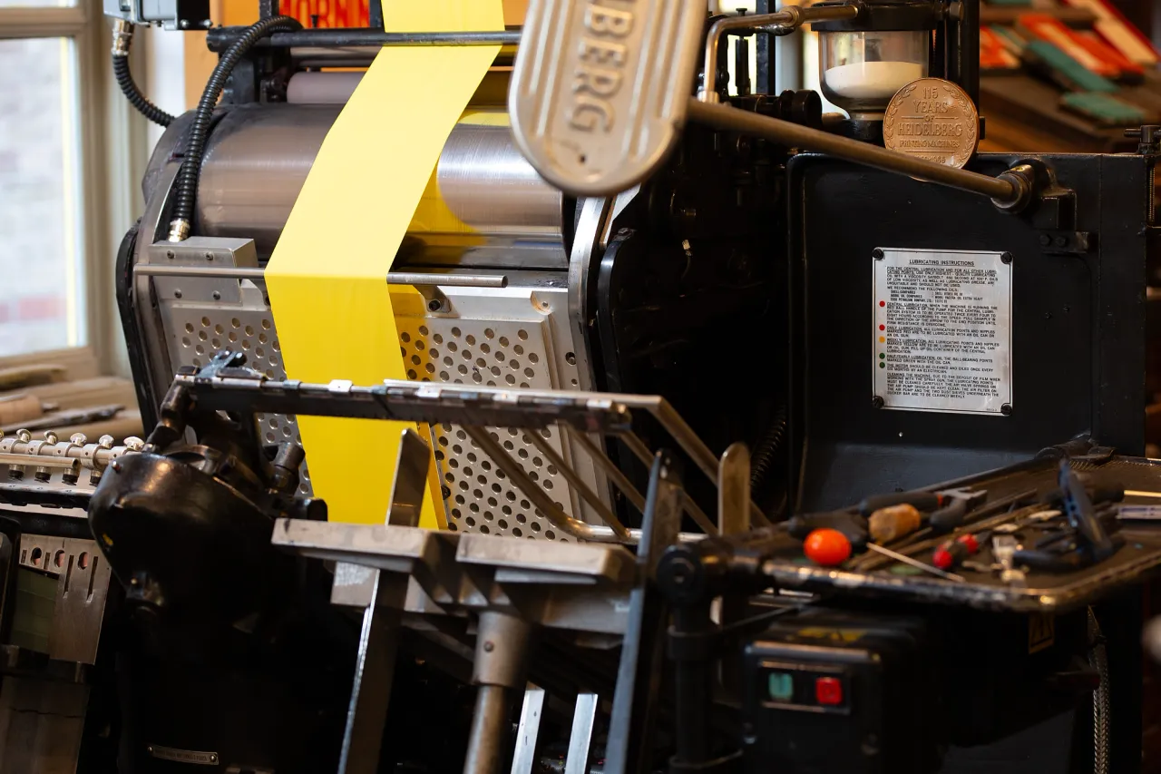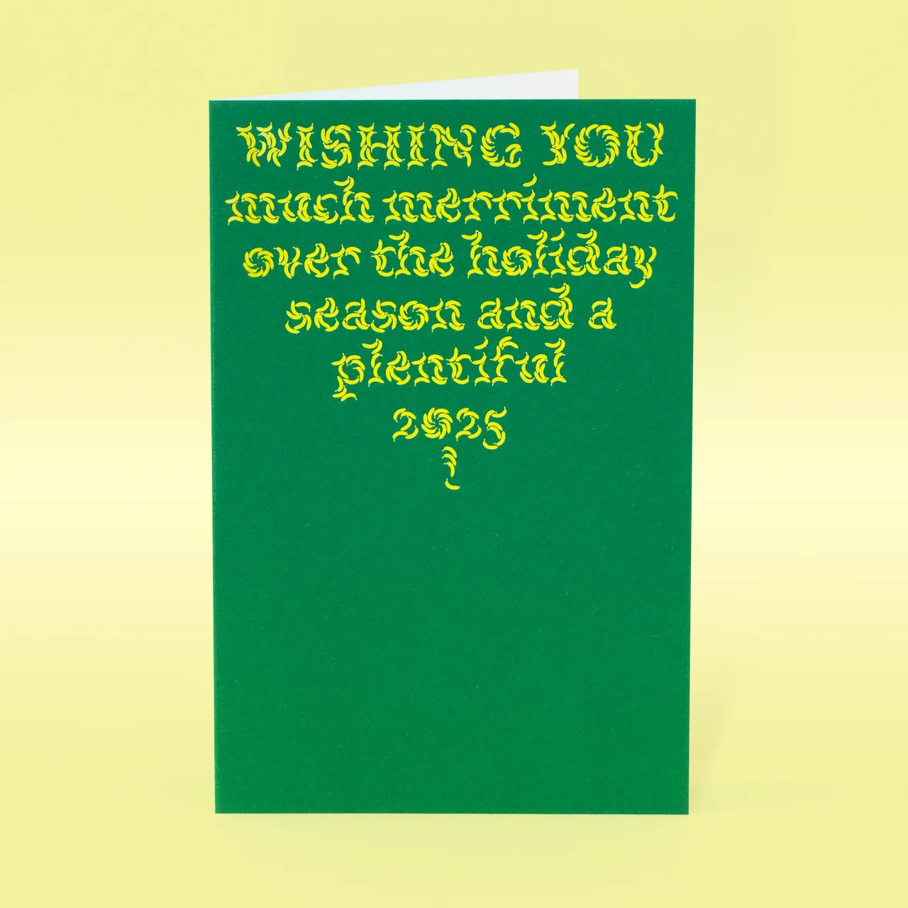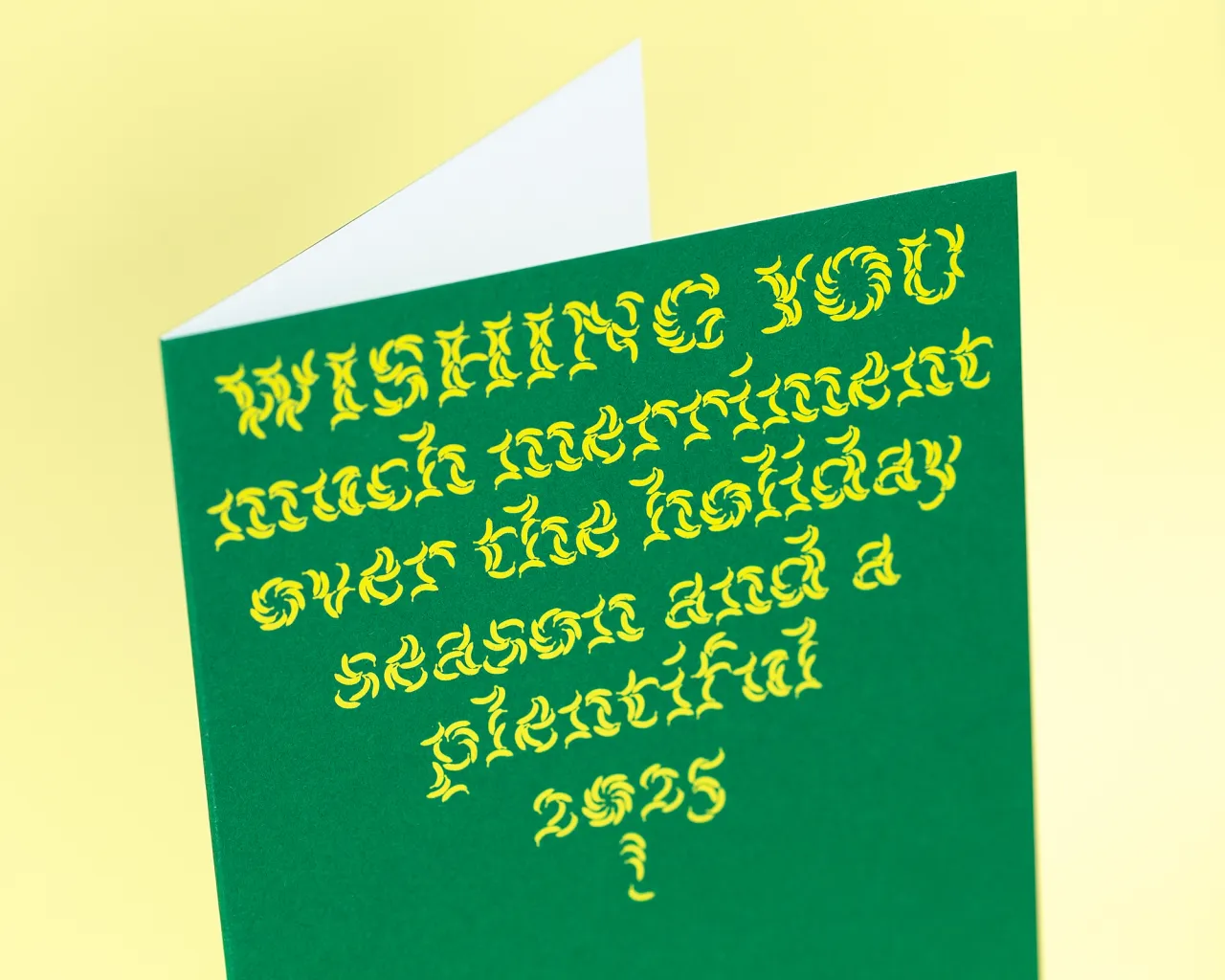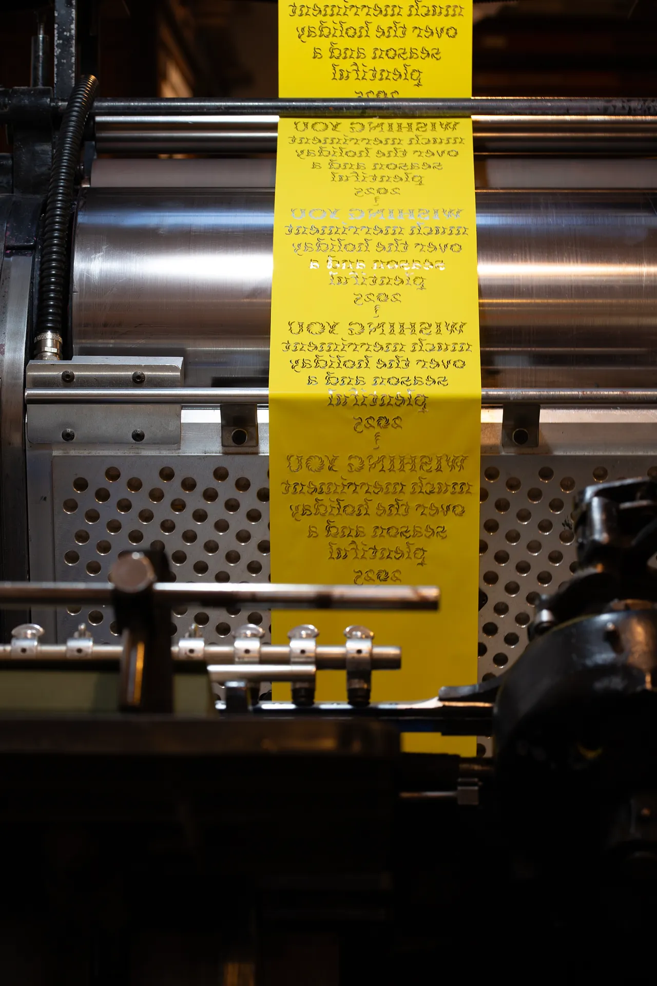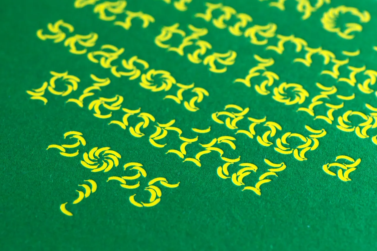 Hot foil stamped in Kurz Colorit 973 yellow pigment foil on 350gsm duplexed GF Smith Colorplan Lockwood Green/Powder Green card stock, machine scored & folded.
